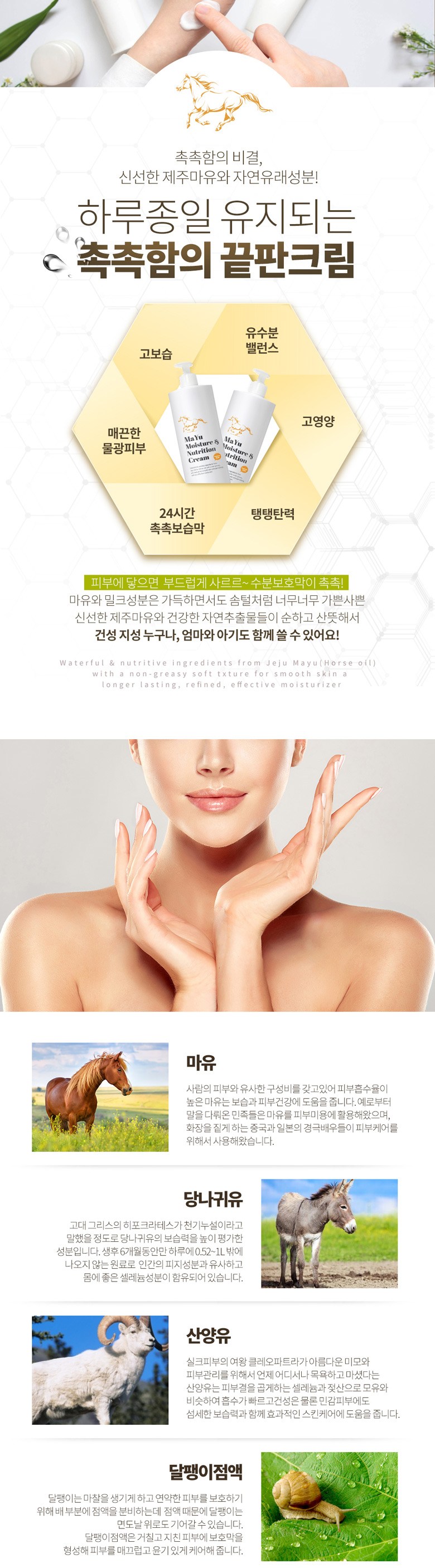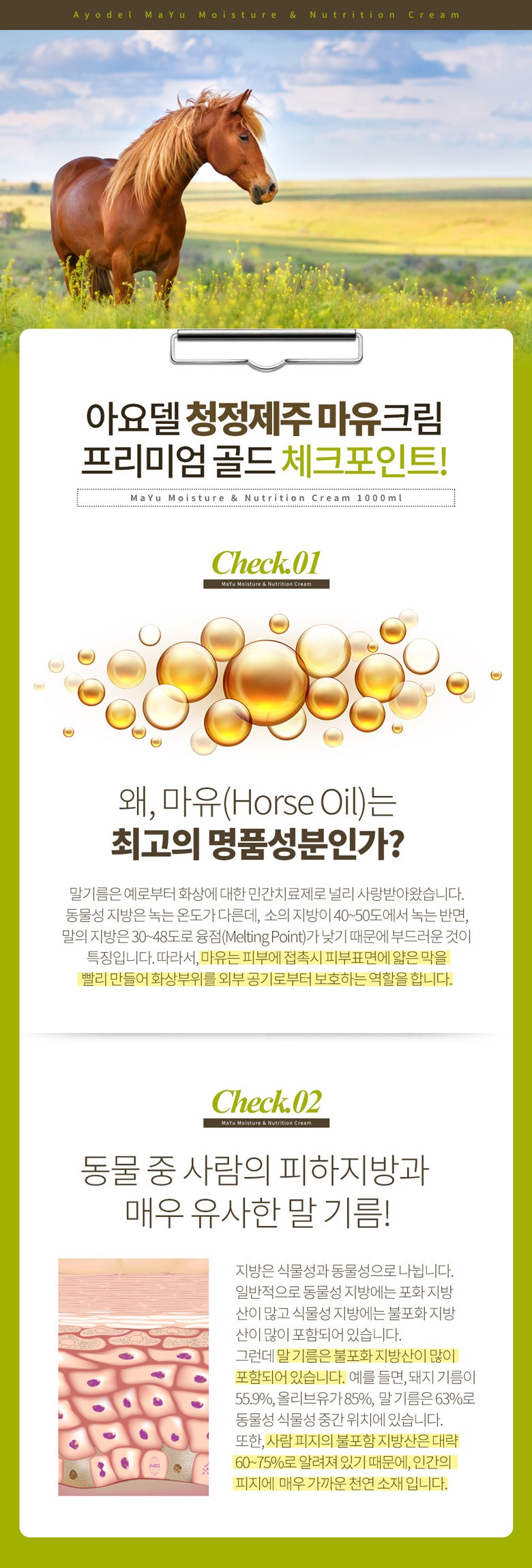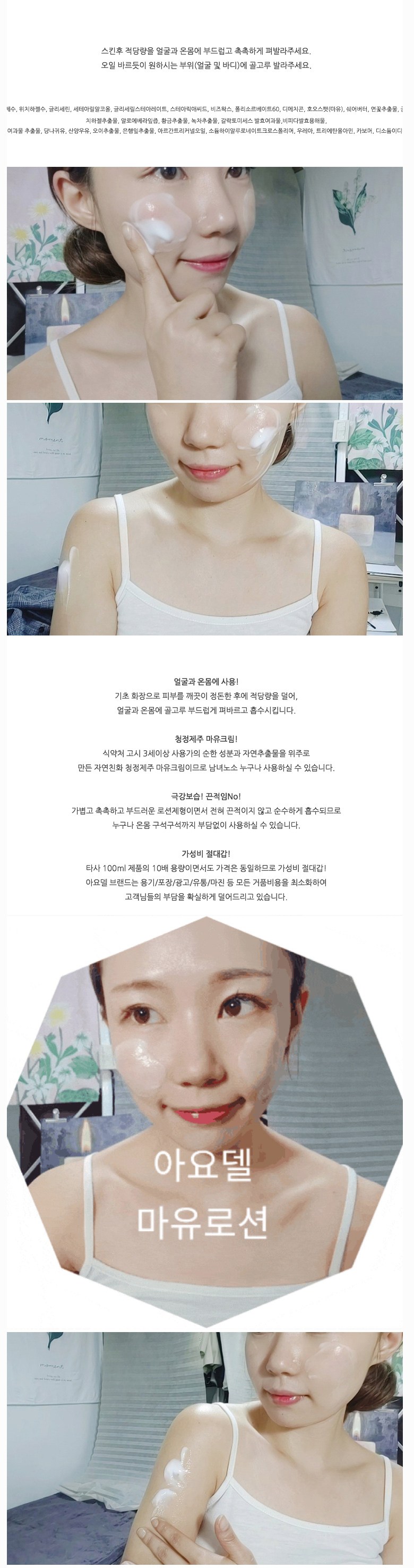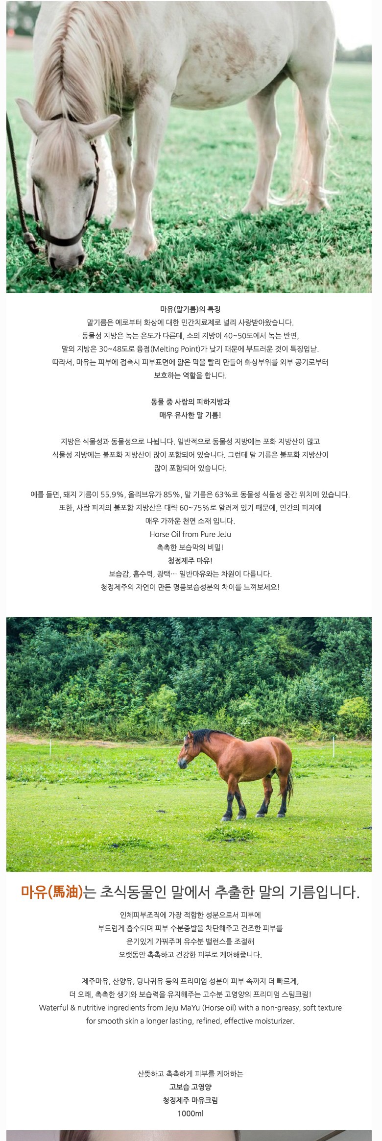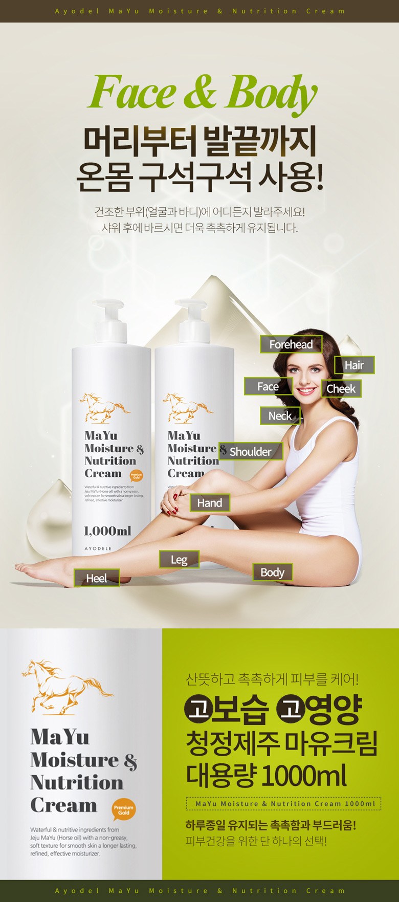 | 용량(중량) | 아요델 청정제주 고보습 고영양 마유크림 1,000ml | 제품 주요 사양 | 모든 피부용 / 순한 자연성분 |