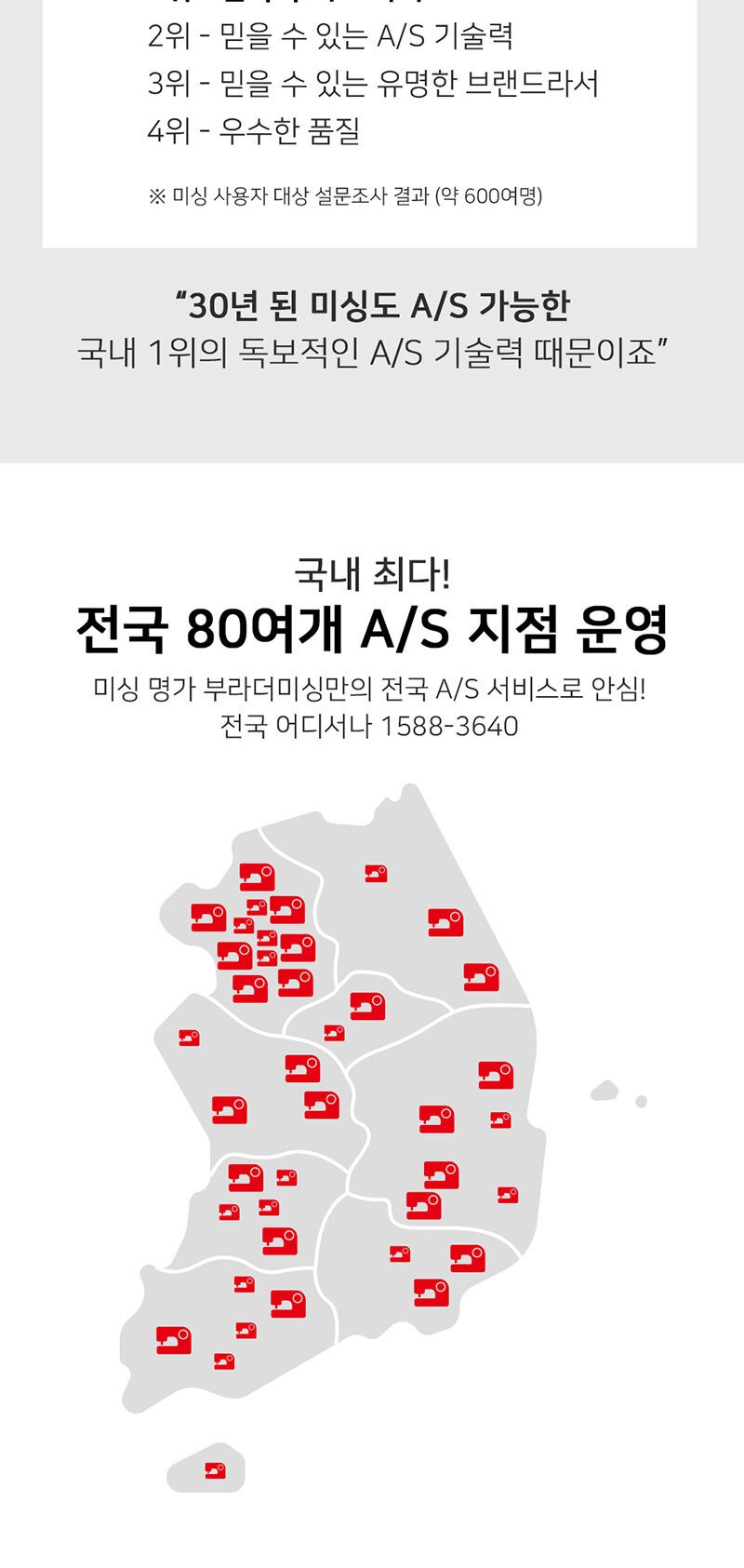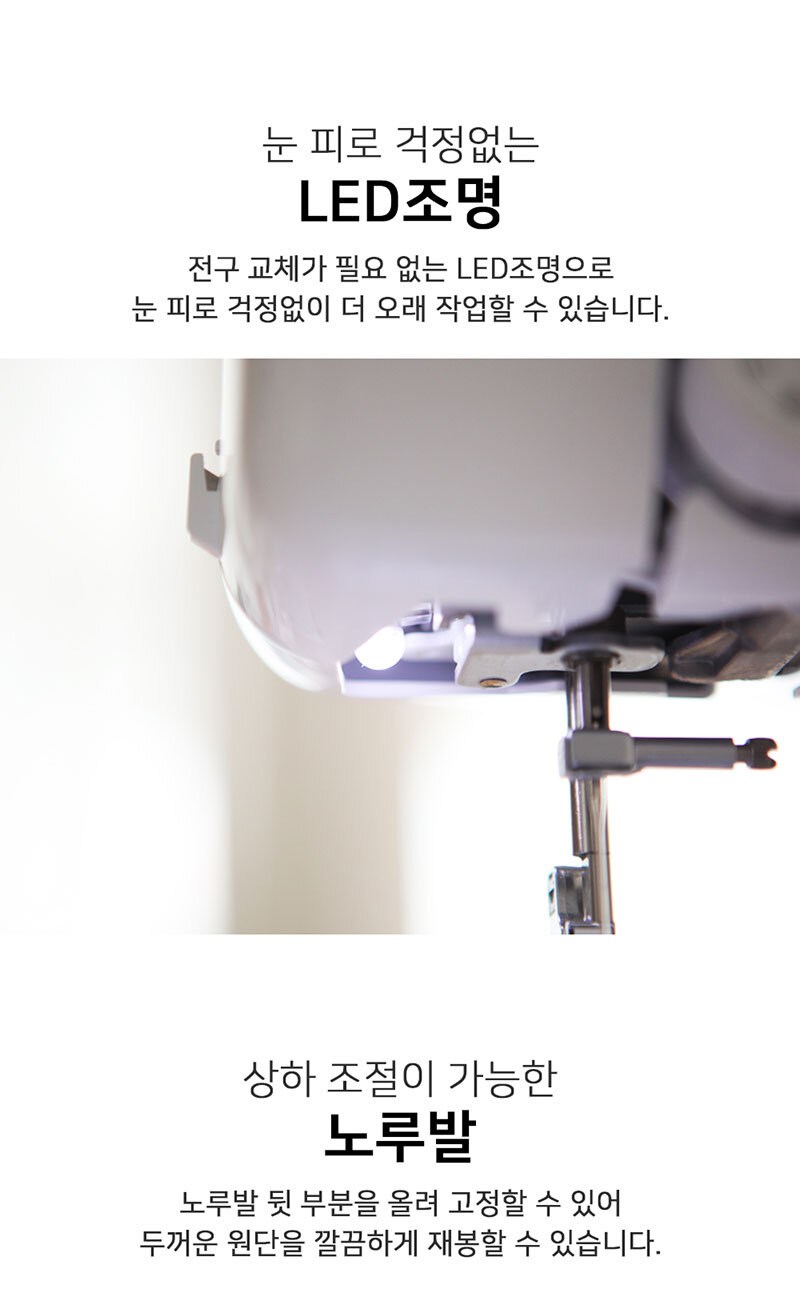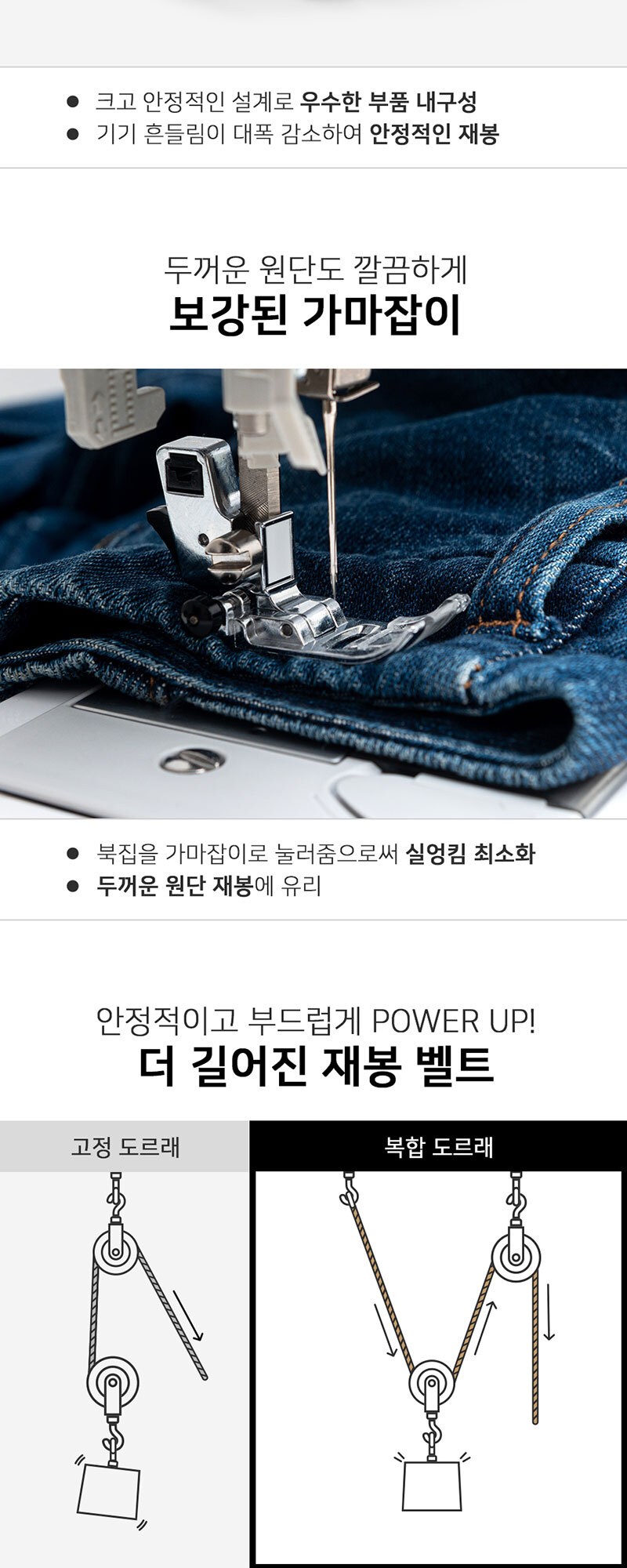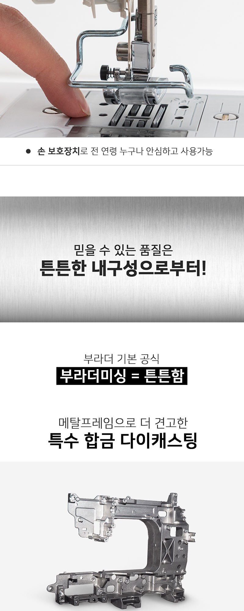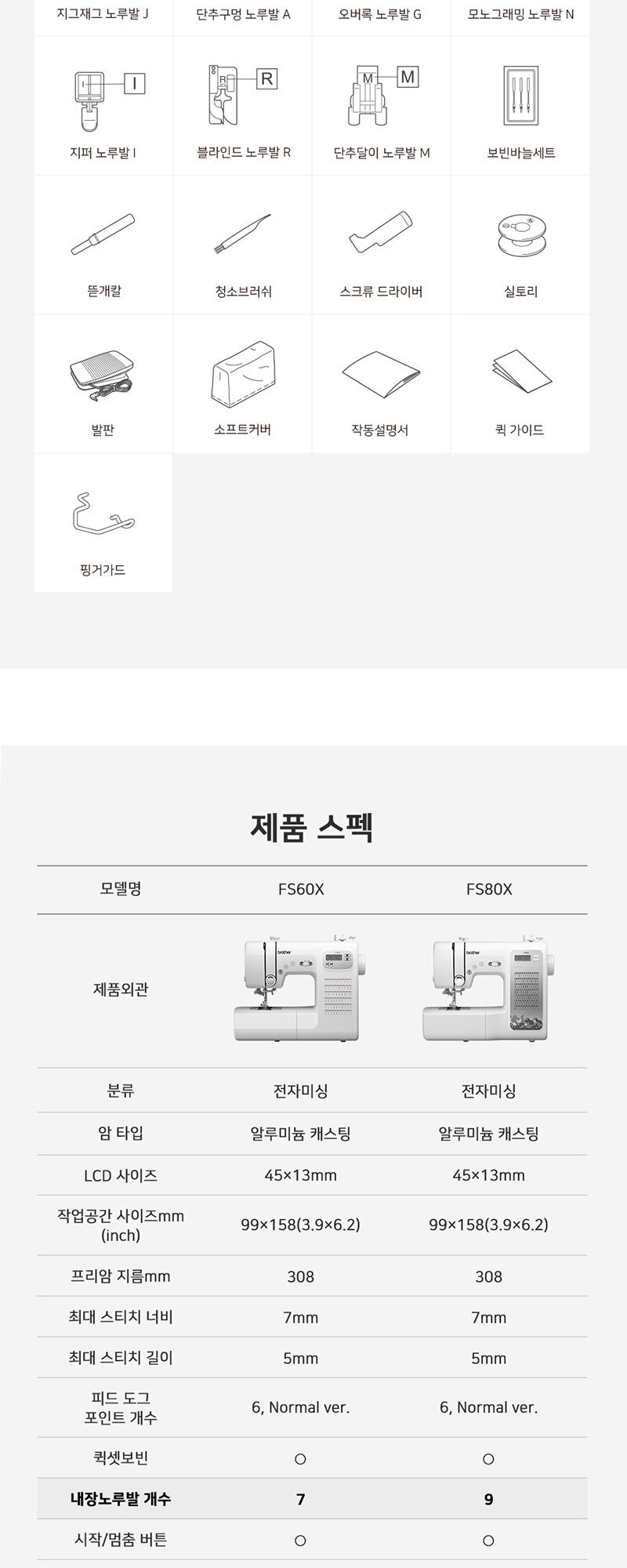 - 구성품: 지그재그 노루발 J 1p+ 단추구멍 노루발 A 1p + 오버록 노루발 G 1p + 모노그래밍 노루발 N 1p + 지퍼 노루발 I 1p + 블라인드 노루발 R 1p + 단추달이 노루발 M 1p + 보빈 바늘세트 1p + 뜯개칼 1p + 청소브러쉬 1p + 스크류 드라이버 1p + 실토리 1p + 발판 1p + 소프트커버 1p + 핑거가드 1p