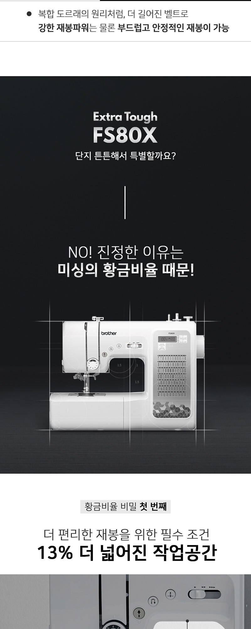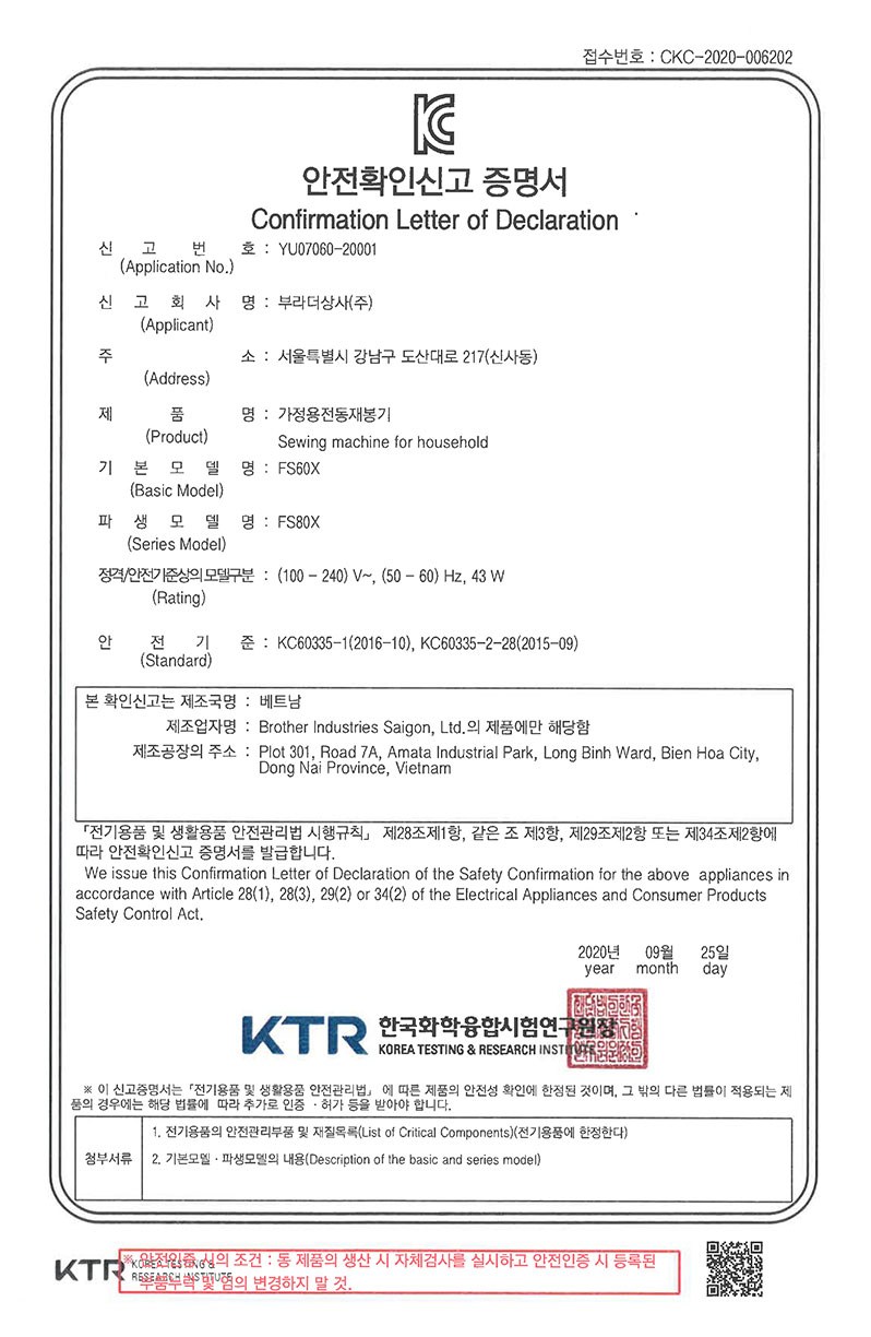 | 품명 및 모델명 | 부라더 스마트 전자 퀼트 미싱/ FS80X | KC 인증정보 | YU07060-20001, R-R-BRT-FS80X |