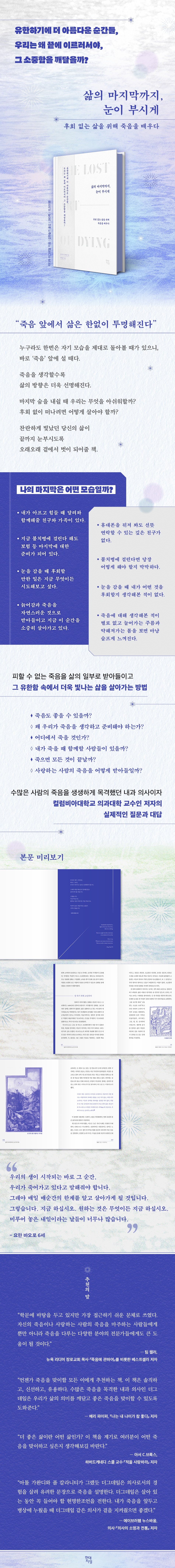 죽음을 준비하는 일은 결코 삶과 동떨어지지 않는다. 오히려 ‘잘 살기 위한’ 모든 일상의 소소한 노력은 잘 죽기 위한 연습이 될 수 있다. 이 책은 언젠가 모두가 죽음 앞에서 던지게 될 가장 중요한 질문에 대한 답을 찾도록 도와준다. 잘 준비한 마지막은 오늘 당신의 삶을 한층 더 행복하고 가치 있게 만들 것이다.