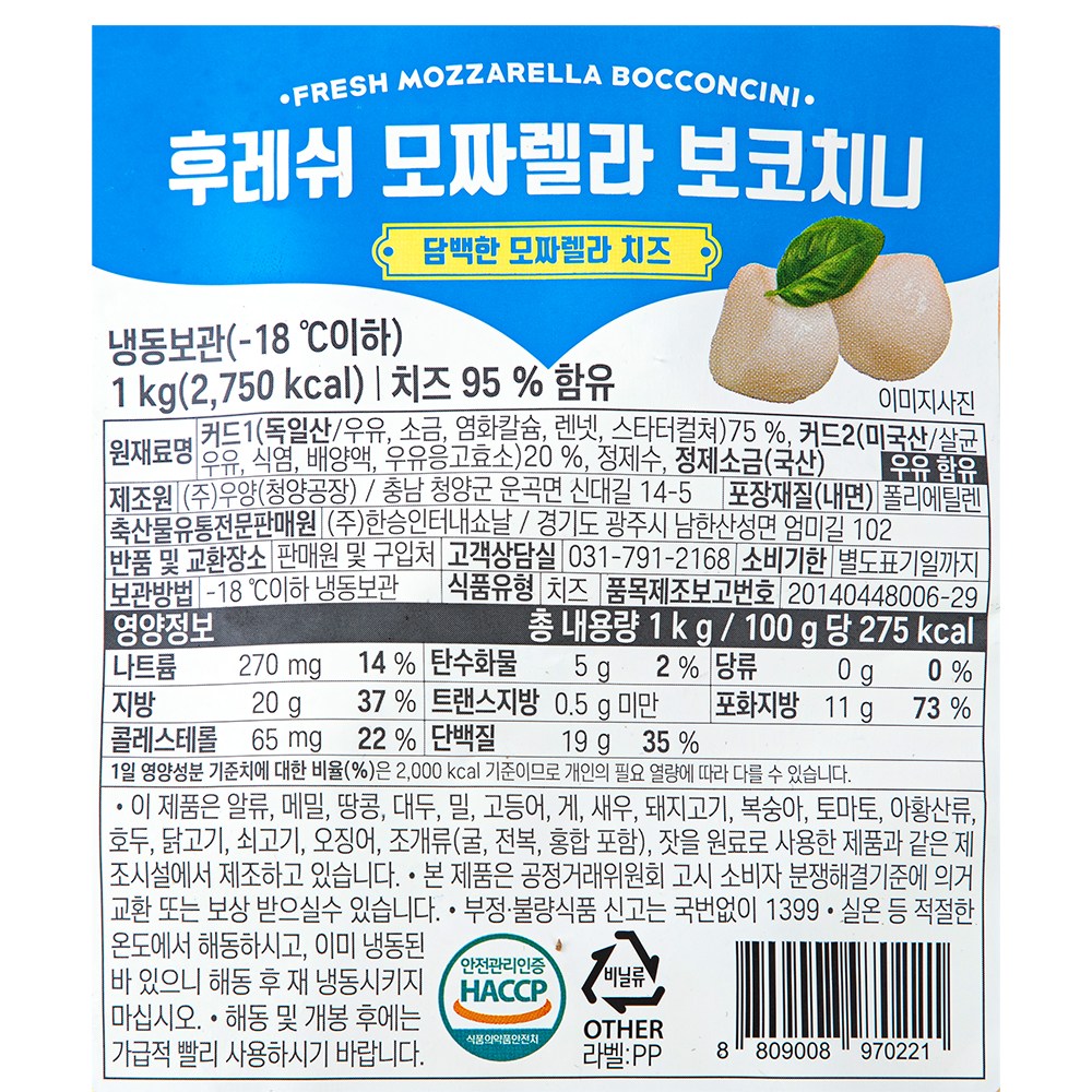| 제품명 | 후레쉬 모짜렐라 보코치니 | 식품의 유형 | 컨텐츠 참조 |