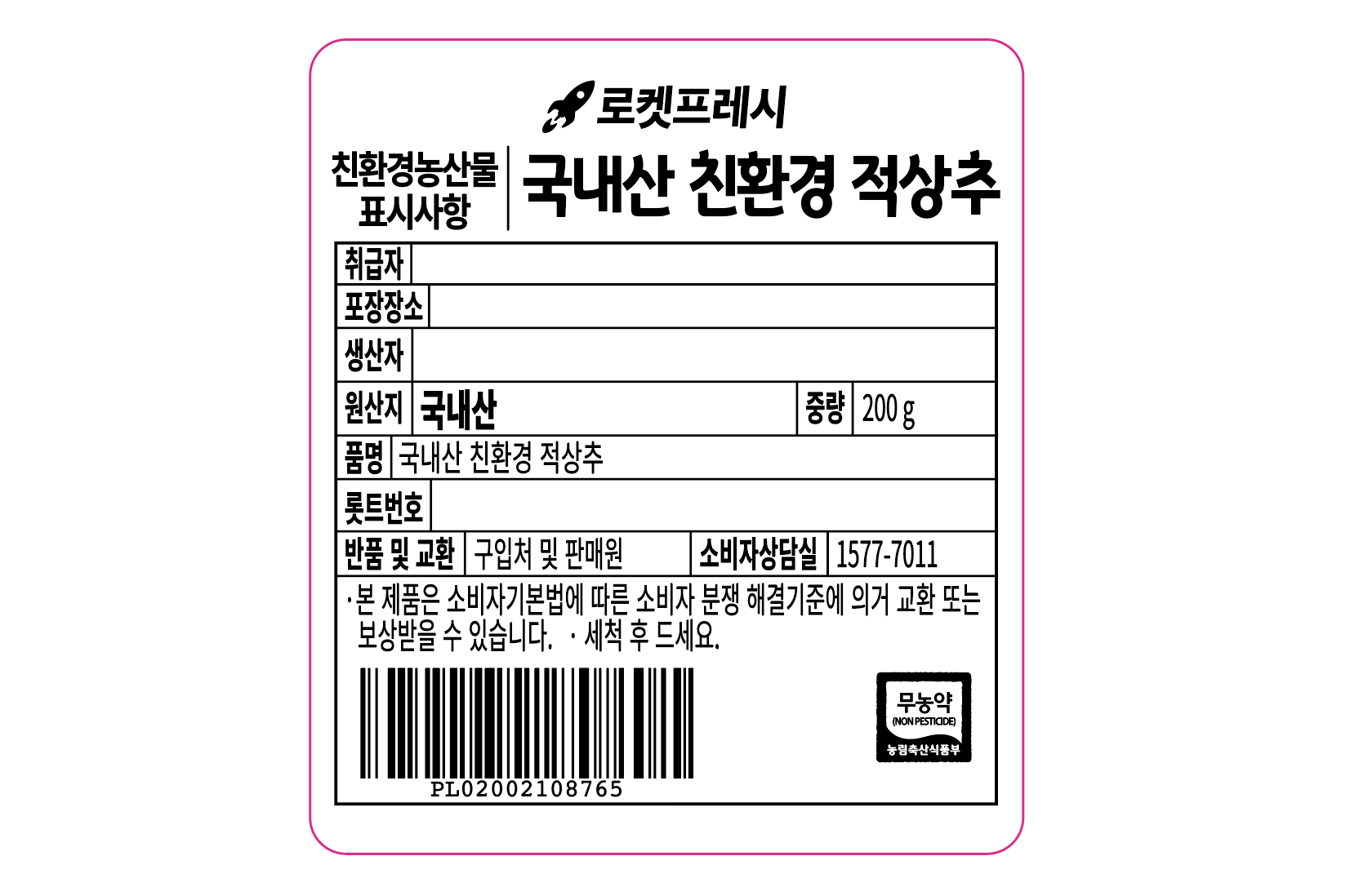 | 배송방법 | 신선/냉장/냉동 | 배송비 | 무료배송 - 로켓프레시 상품 중 15,000원 이상 구매 시 무료배송 - 해당 서비스 가능 지역에 한함 |