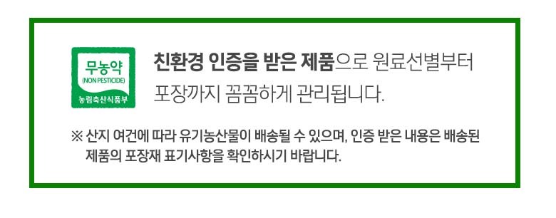| 생산자(수입자) | 농업회사법인 상청정 주식회사, 느영나영영농조합법인, 뜰앤들 영농조합법인, 만인산농협산지유통센타(일반, 친환경, GAP 농산물), 영농조합법인 만강, 해달친환경 | 원산지 | 컨텐츠 참조 |