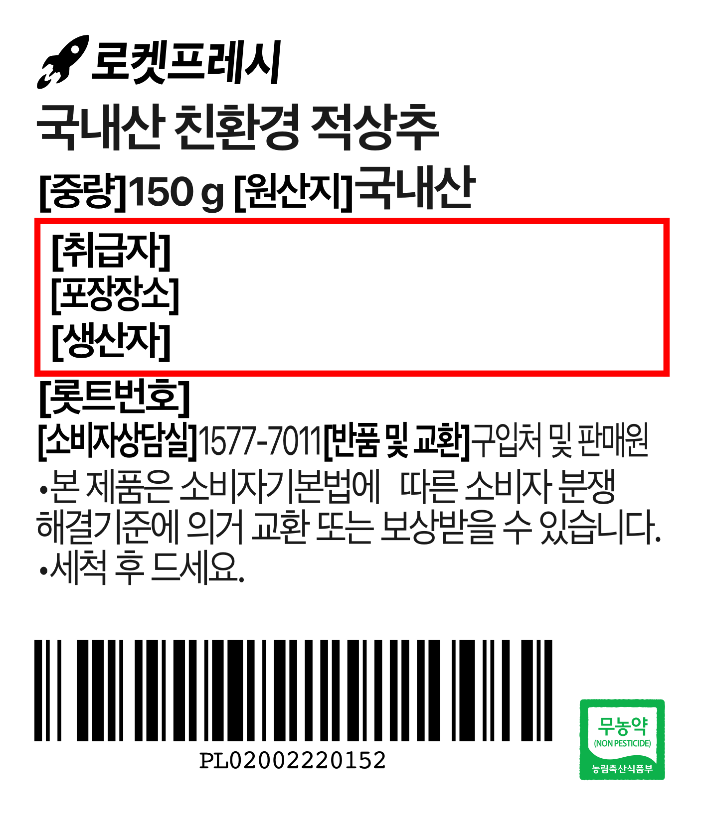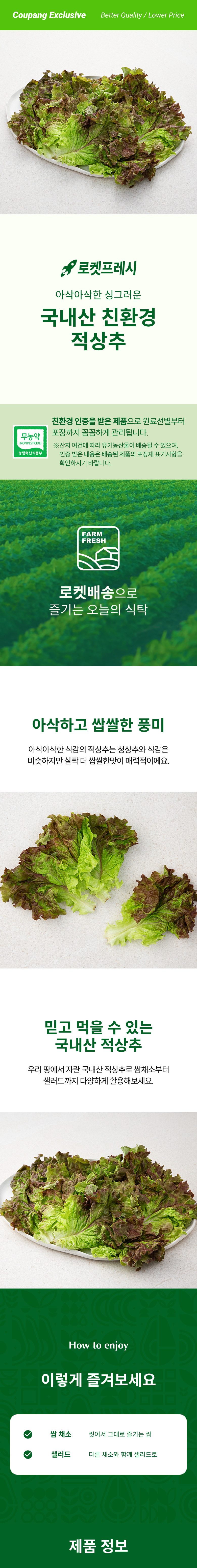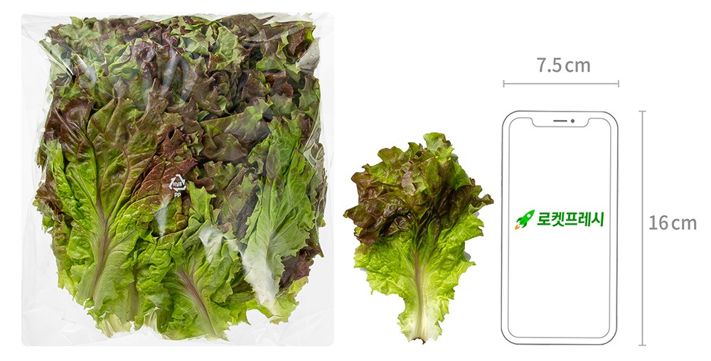 | 품목 또는 명칭 | 국내산 친환경 적상추 | 포장단위별 내용물의 용량(중량),수량,크기 | 150gx3개 |