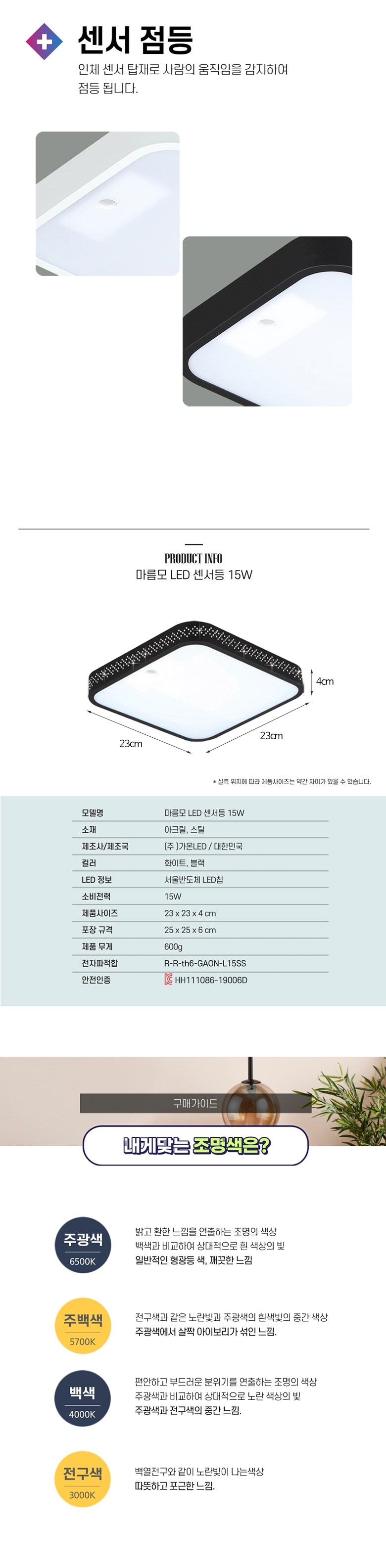| 품명 및 모델명 | 마름모 LED 센서등 블랙 GAON-L15SSA | KC 인증정보 | HH111086-19006D, R-R-th6-GAON-L15SS |