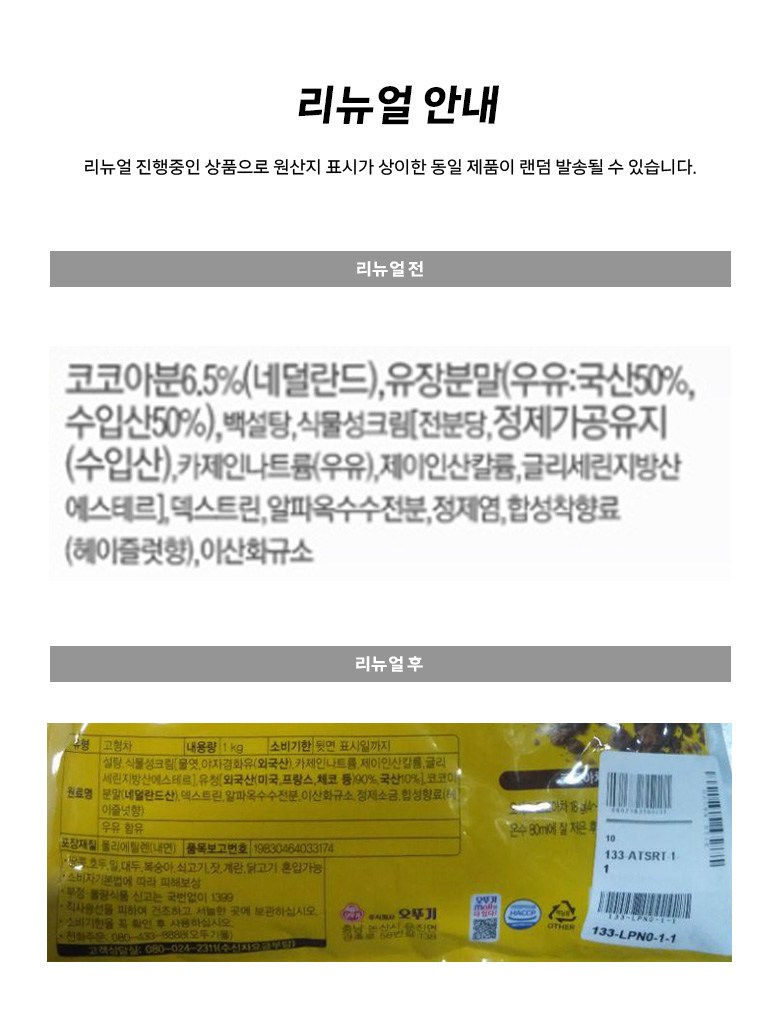 | 포장단위별 내용물의 용량(중량), 수량 | 1kg, 6개 | 원재료명 및 함량 | 컨텐츠 참조 |