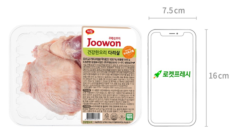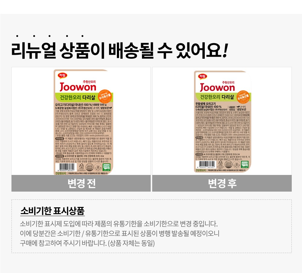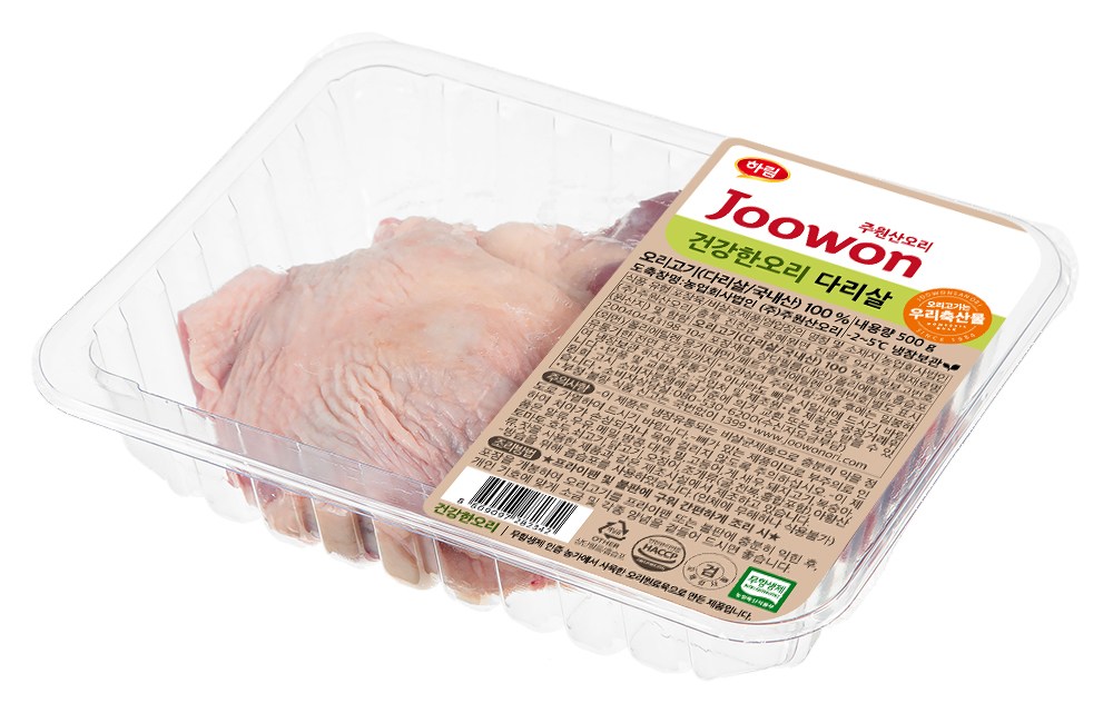 | 품목 또는 명칭 | 건강한 오리 다리살 | 포장단위별 내용물의 용량(중량),수량,크기 | 500g x 2개,1개 |