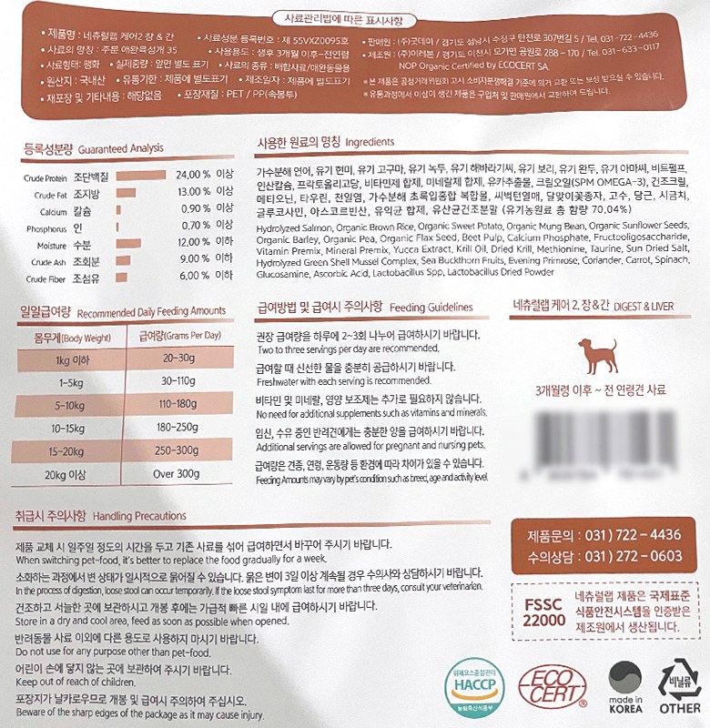 | 품명 및 모델명 | 네츄럴랩 케어2 장 & 간 | 인증/허가 사항 | 사료관리법에 따른 성분등록번호 : 컨텐츠 참조 |