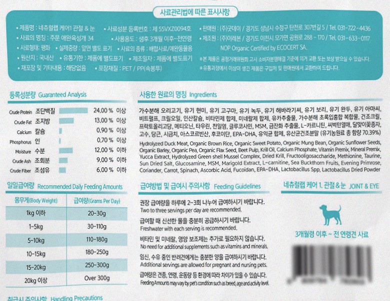 | 품명 및 모델명 | 네츄럴랩 케어1 관절 & 눈 | 인증/허가 사항 | 사료관리법에 따른 성분등록번호 : 컨텐츠 참조 |