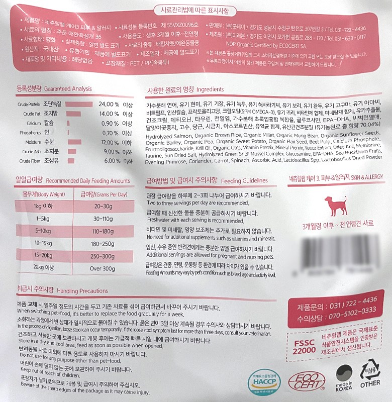 | 품명 및 모델명 | 네츄럴랩 케어3 피부 & 알러지 | 인증/허가 사항 | 사료관리법에 따른 성분등록번호 : 컨텐츠 참조 |