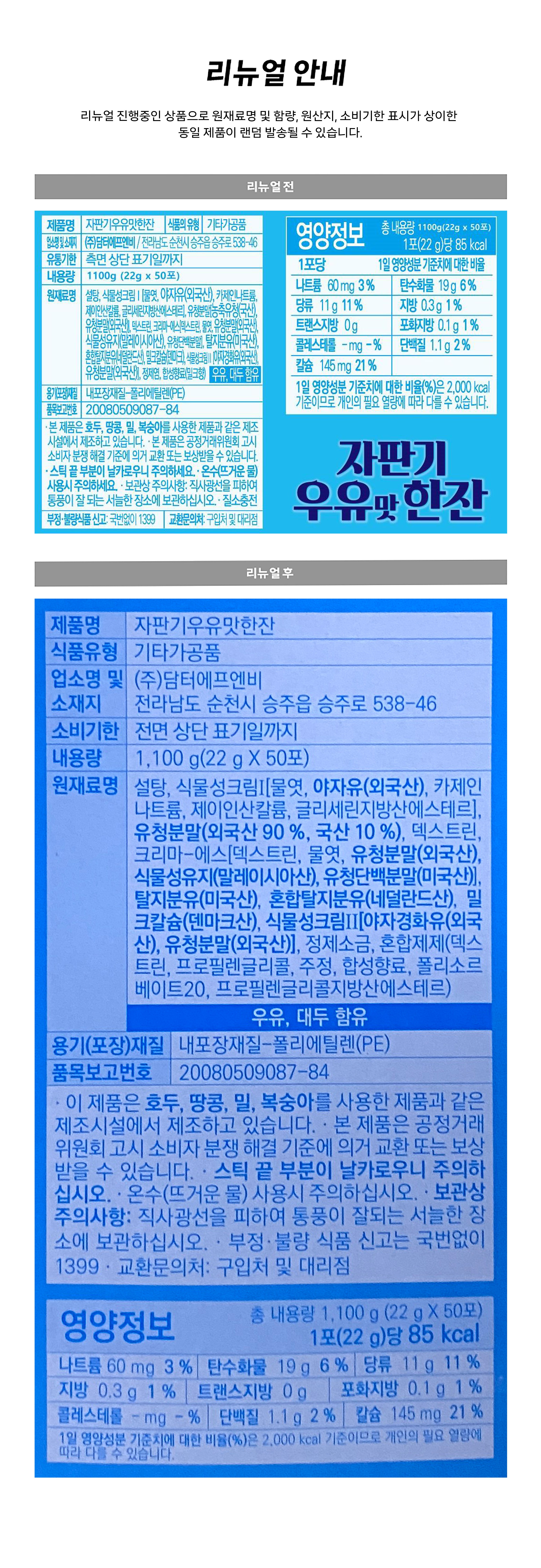 | 제품명 | 자판기우유맛한잔 | 식품의 유형 | 기타가공품 |