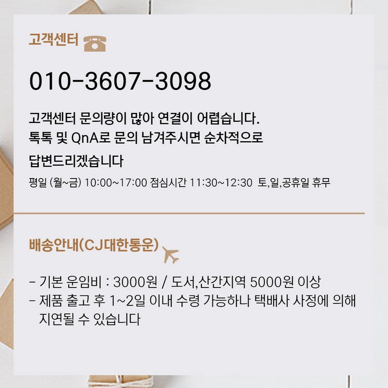 - ㆍ모니터 해상도의 차이로 인해 색상이나 이미지가 실제와 달라, 고객이 단순 변심으로 교환/반품을 무료로 요청하는 경우