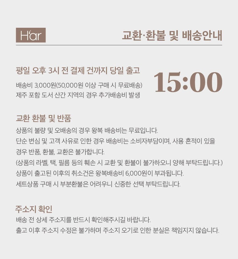 | 배송방법 | 순차배송 | 배송비 | 3,000원 - 50,000원 이상 구매 시 무료배송 · 도서산간 추가 배송비 - 제주 지역: 3,000원 - 도서산간 지역: 6,000원 |