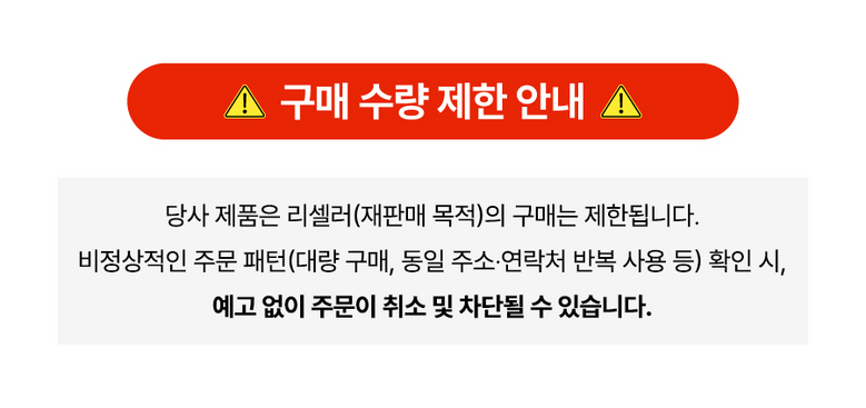 | 교환/반품 신청 기준일 | ㆍ단순변심에 의한 교환/반품은 제품 수령 후 7일 이내까지, 교환/반품 제한사항에 해당하지 않는 경우에만 가능 (배송비용과 교환/반품 비용 왕복배송비 고객부담) ㆍ상품의 내용이 표시·광고의 내용과 다른 경우에는 상품을 수령한 날부터 3개월 이내, 그 사실을 안 날 또는 알 수 있었던 날부터 |