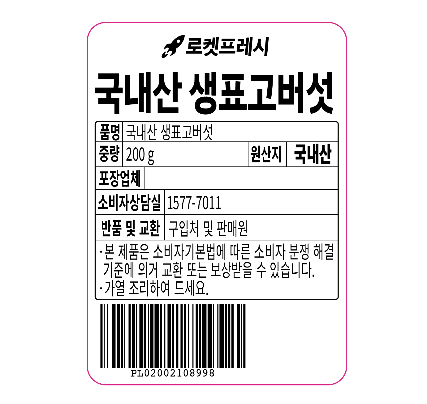 | 배송방법 | 신선/냉장/냉동 | 배송비 | 무료배송 - 로켓프레시 상품 중 15,000원 이상 구매 시 무료배송 - 해당 서비스 가능 지역에 한함 |