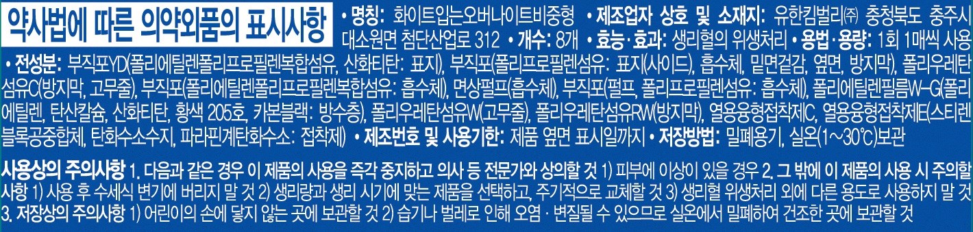 | 품명 및 모델명 | 화이트입는오버나이트비중형 | 인증/허가 사항 | 의약외품 |