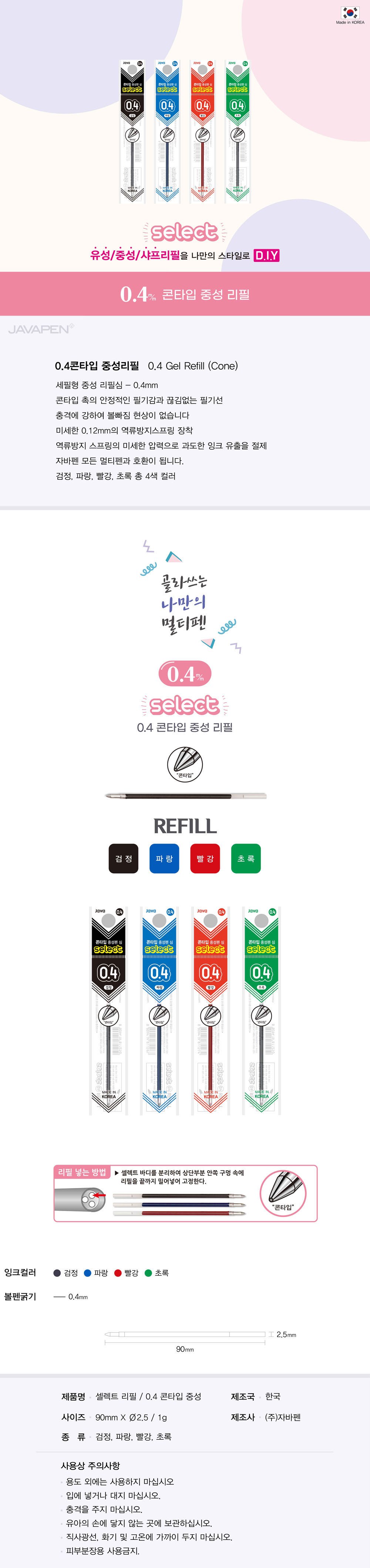 | 품명 및 모델명 | 자바펜 셀렉트 중성펜심 콘타입 리필 0.4mm | 인증/허가 사항 | 컨텐츠참조 |