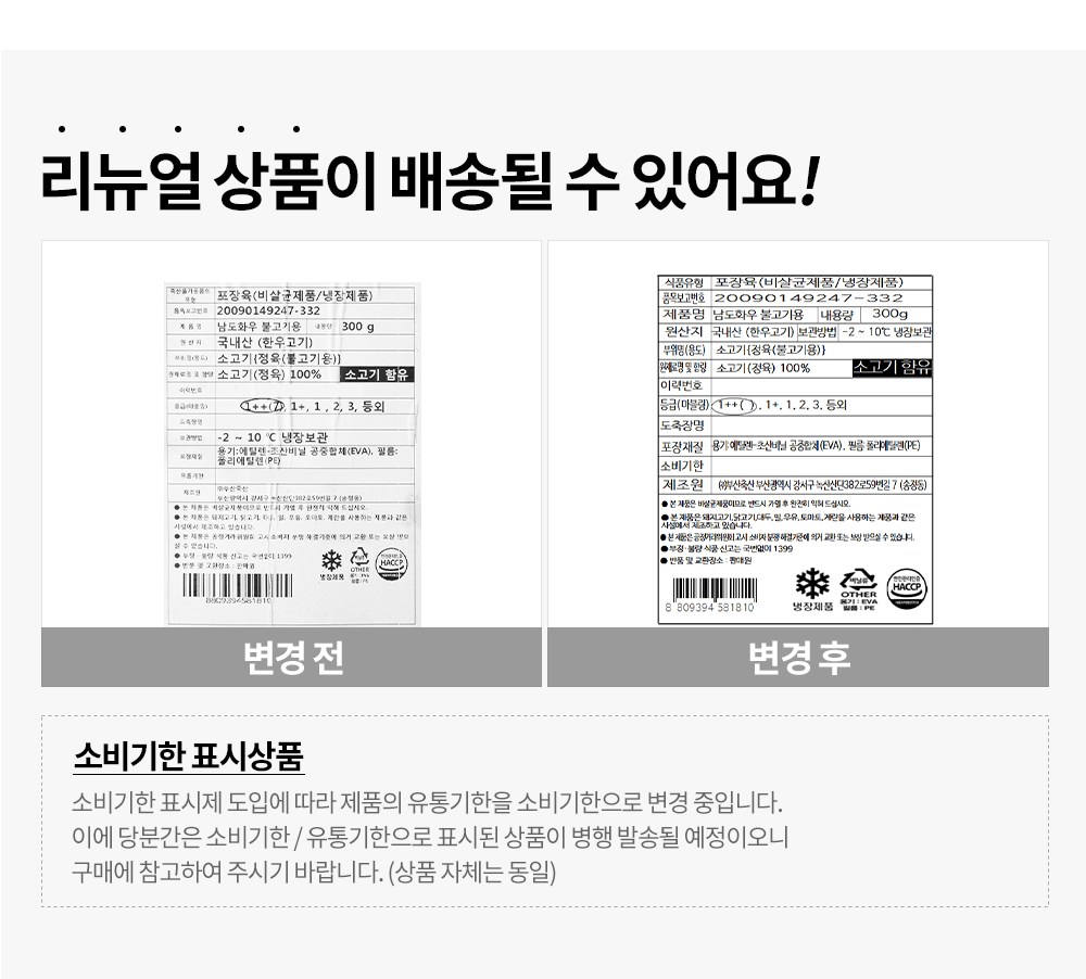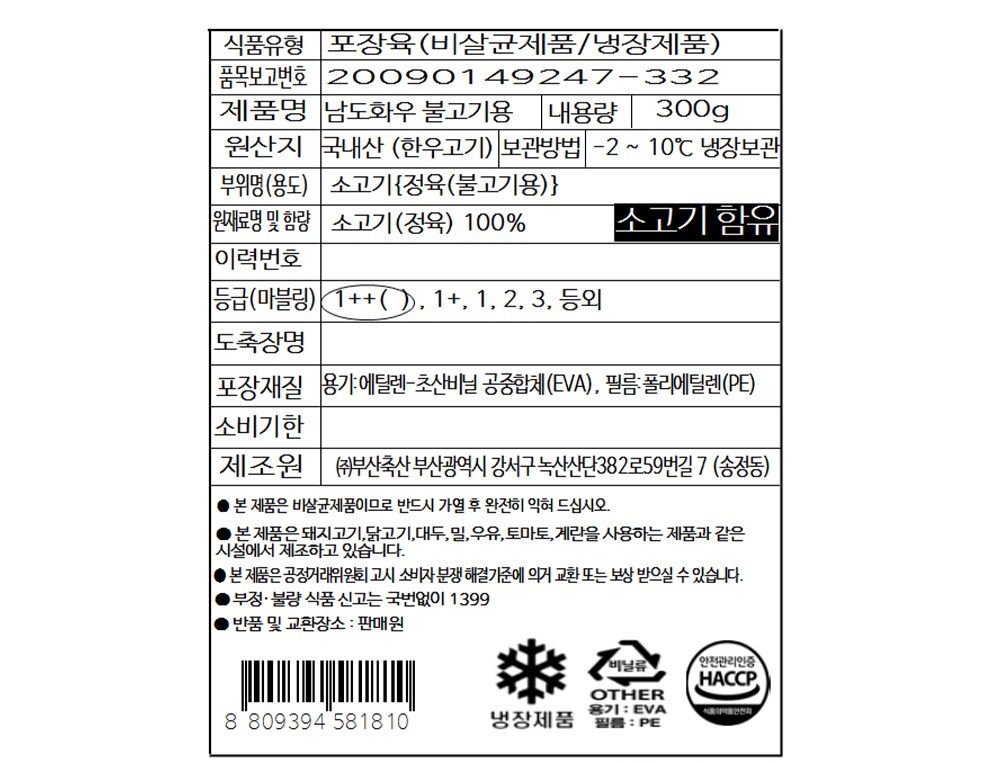 | 품목 또는 명칭 | 남도화우 불고기용 | 포장단위별 내용물의 용량(중량),수량,크기 | 300g,1개 |