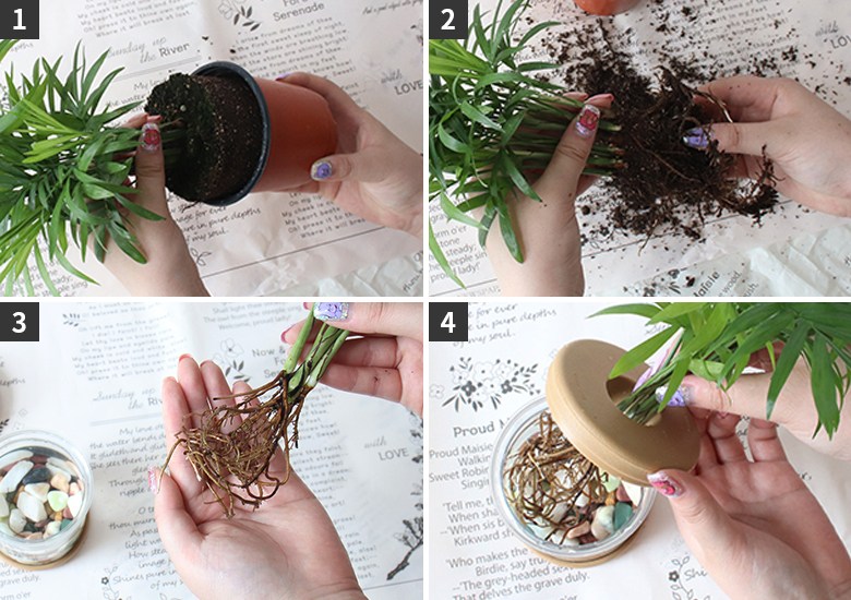 1. 식물을 플라스틱 포트에서 꺼내 흙을 털어줍니다.