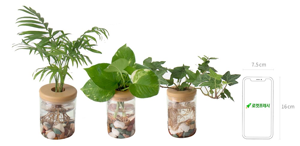 싱그러운 생명력을 선사하는 수경식물 3종을 만나보세요. 손쉽게 키우기 좋은 테이블야자, 공기 정화 능력이 좋은 아이비와 스킨답서스로 구성했어요. 수경식물과 잘 어울리는 화병과 내추럴 컬러의 화병 받침를 함께 보내드려요. 나만의 공간을 더욱 생기 넘치게 꾸밀 수 있을 거예요.