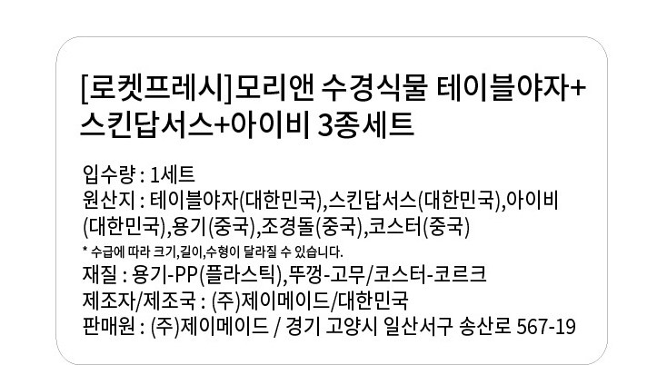 | 품명 및 모델명 | [로켓프레시] 제이메이드 수경식물 3종 (테이블 야자, 스킨답서스, 아이비 세트) | 인증/허가 사항 | 해당없음 |