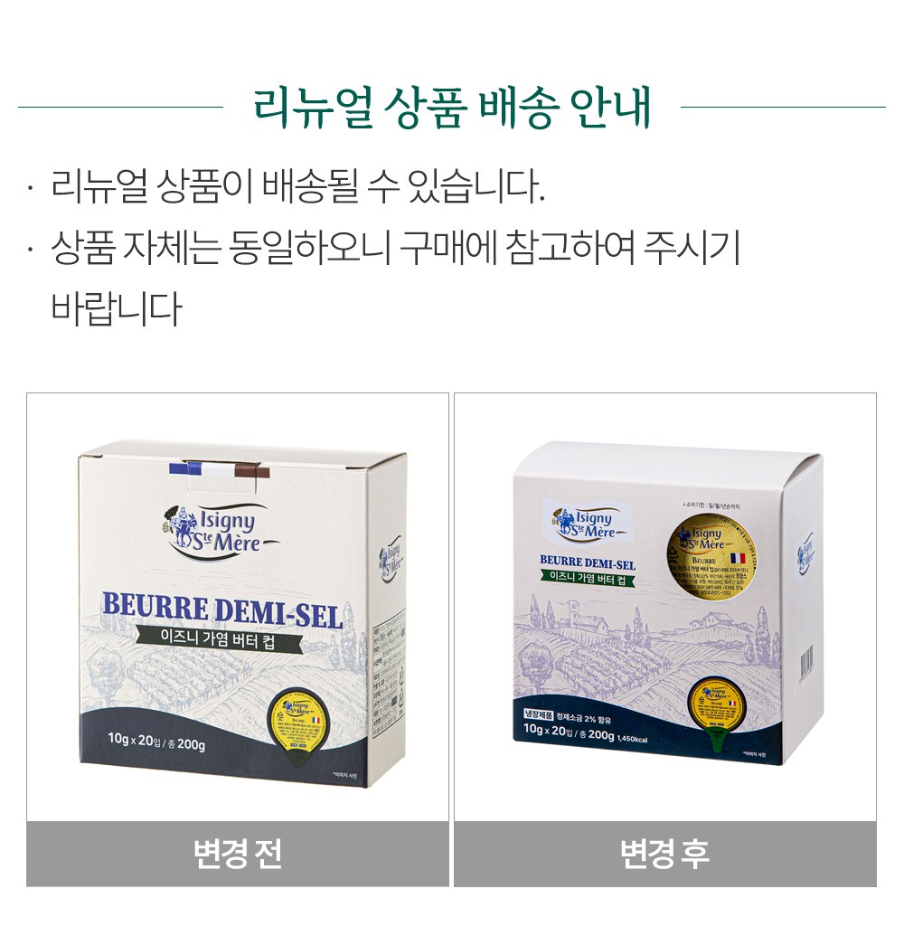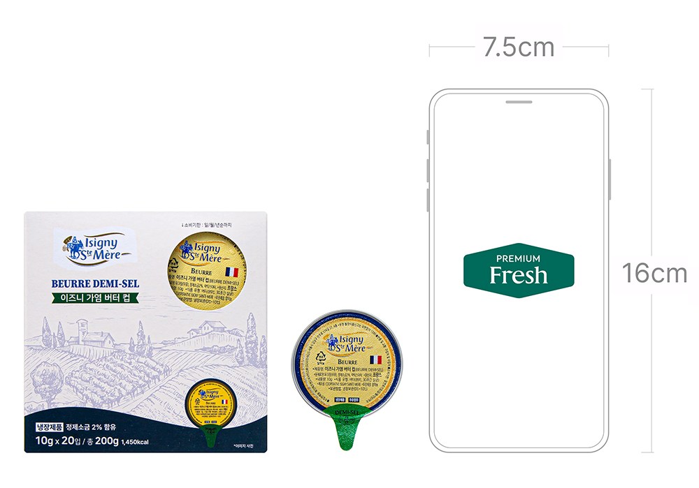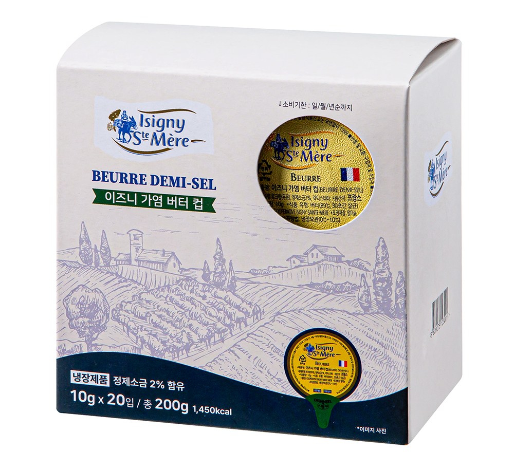 프랑스 노르망디의 이즈니 생메르(Isigny Sainte-Mère) 협동조합이 만든 고급 버터의 대명사입니다. 이 버터가 특별한 이유는 바로 노르망디 지역의 독특한 자연환경과 전통적인 제조법에 있습니다. 전통적인 발효와 숙성 과정을 거쳐야만 이즈니 버터 고유의 풍미를 얻을 수 있죠. 소금 간이 되어 있어, 음식에 짭조름한 풍미를 더하기 좋아요. 한 번에 먹기 좋은 10g 분량이 컵에 담겨 있으니, 소분할 필요 없이 간편하게 활용해보세요.