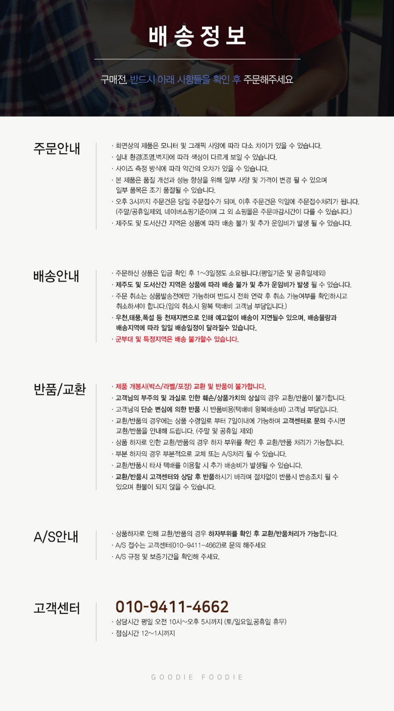 - ㆍ모니터 해상도의 차이로 인해 색상이나 이미지가 실제와 달라, 고객이 단순 변심으로 교환/반품을 무료로 요청하는 경우