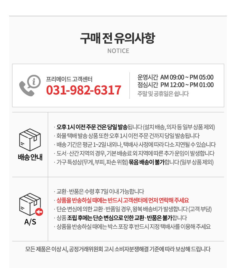 - ㆍ교환/반품에 관한 일반적인 사항은 판매자가 제시사항보다 관계법령이 우선합니다.