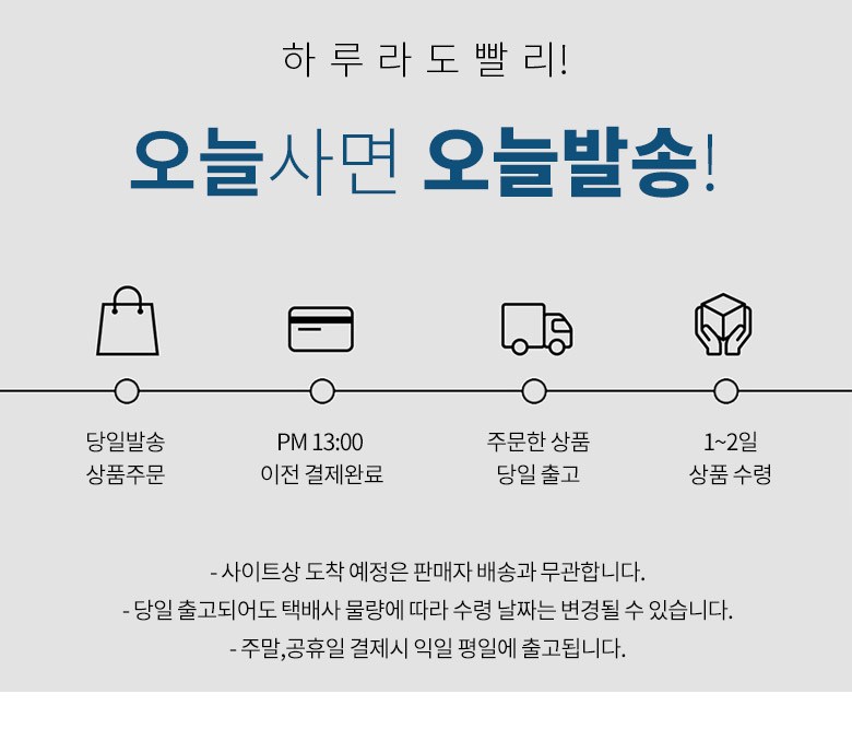 | 배송기간 | ㆍ도서산간 지역 등은 배송에 3-5일이 더 소요될 수 있습니다. - 천재지변, 물량 수급 변동 등 예외적인 사유 발생 시, 다소 지연될 수 있는 점 양해 부탁드립니다. | ||