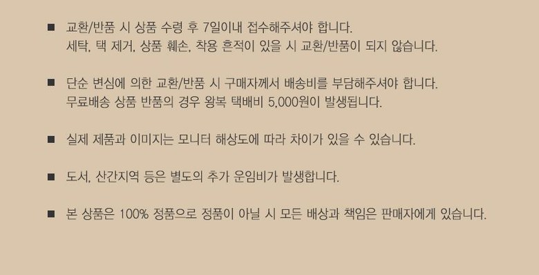- ㆍ모니터 해상도의 차이로 인해 색상이나 이미지가 실제와 달라, 고객이 단순 변심으로 교환/반품을 무료로 요청하는 경우