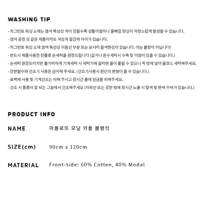 | 품명 및 모델명 | 마롤로뜨 유아용 모달 와플 블랭킷 | KC 인증정보 | CB017M001-0012 |