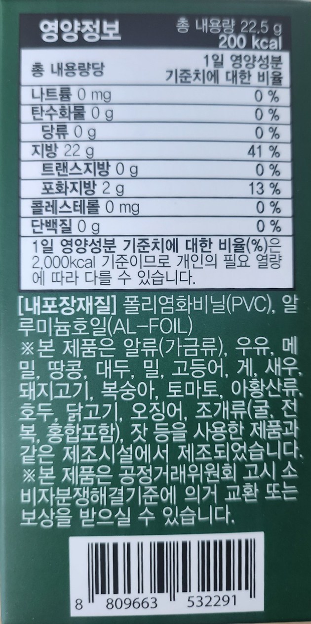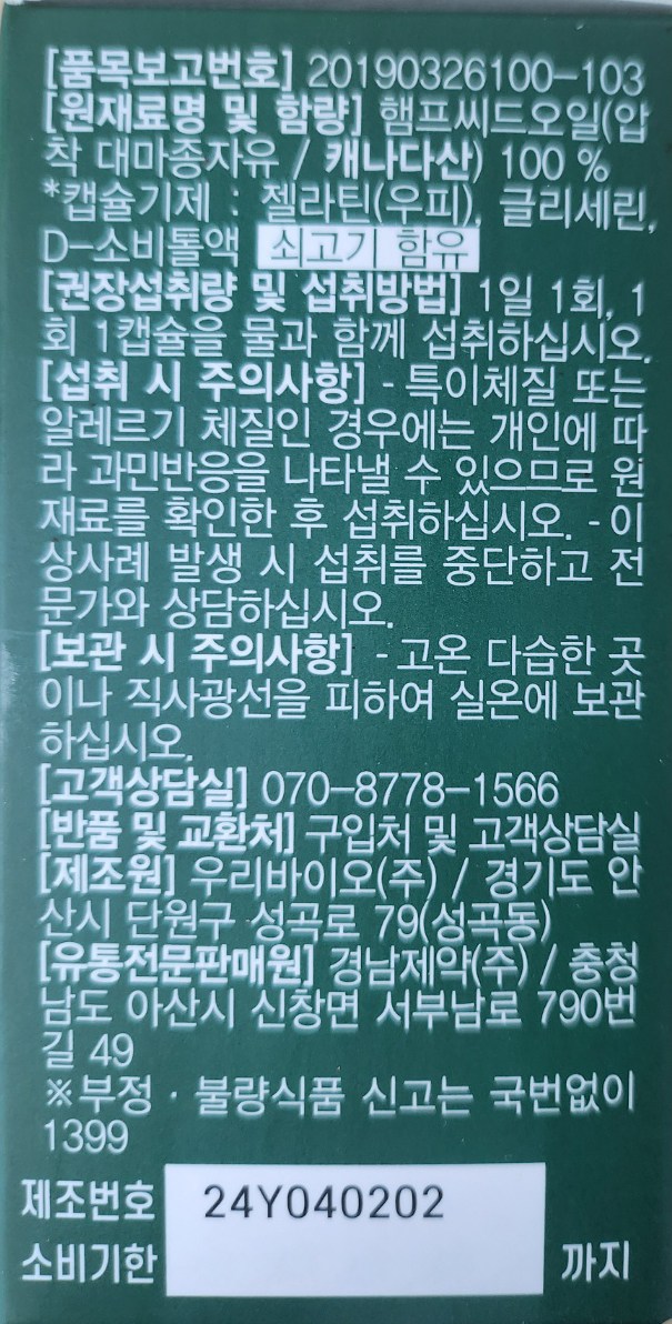 | 제품명 | 프라임 대마종자유 | 식품의 유형 | 컨텐츠 참조 |