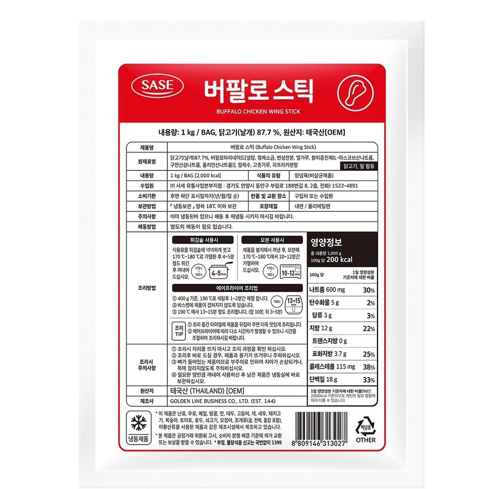 맥주에 어울리는 짭조름한 안주가 필요할 때, 사세의 버팔로 스틱을 만나보세요. 은근하게 매콤한 양념이 쫄깃한 닭 날개에 잘 배어들어 입맛 당기는 간식이랍니다. 기름에 튀기면 바삭하게, 노릇하게 구우면 먹음직스러운 윤기가 흐르는 버팔로 스틱으로 즐기실 수 있지요.