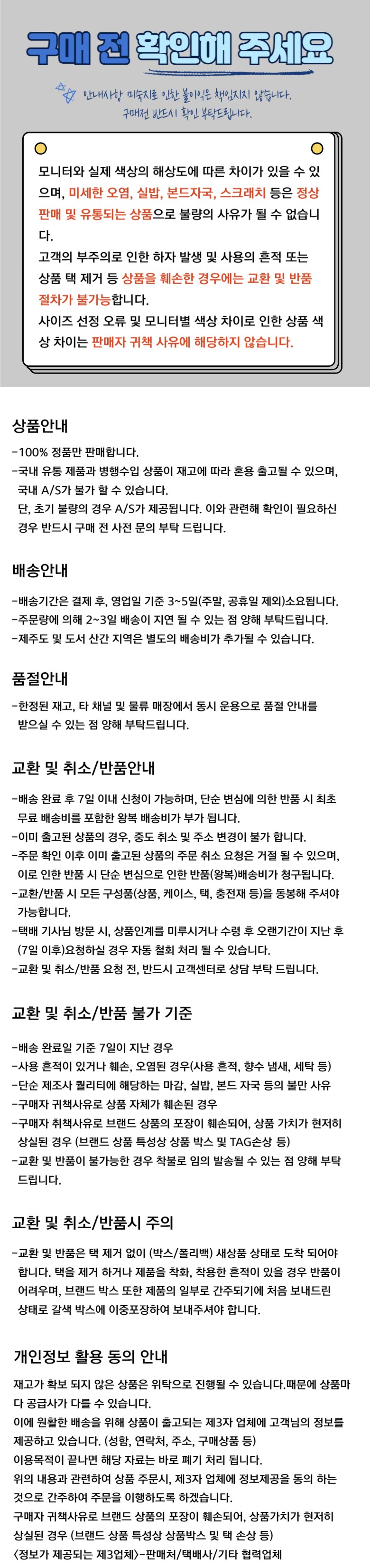 - ㆍ교환/반품에 관한 일반적인 사항은 판매자가 제시사항보다 관계법령이 우선합니다.