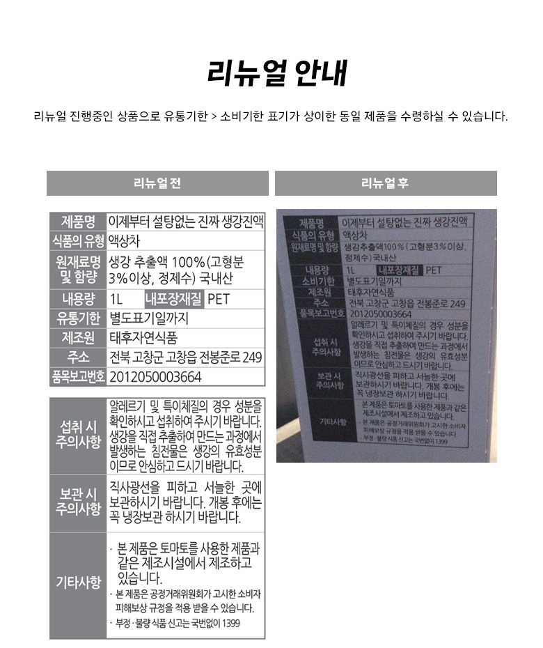 | 제품명 | 이제부터 설탕없는 진짜 생강진액 | 식품의 유형 | 컨텐츠 참조 |