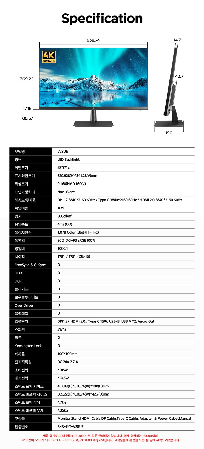 | 품명 및 모델명 | 주연테크 71cm 4K UHD 모니터 / V28UE | KC 인증정보 | 본품: R-R-JYT-V28UE / 전원어댑터: HU10539-17039B, MSIP-REM-FJ1-20173252000 |