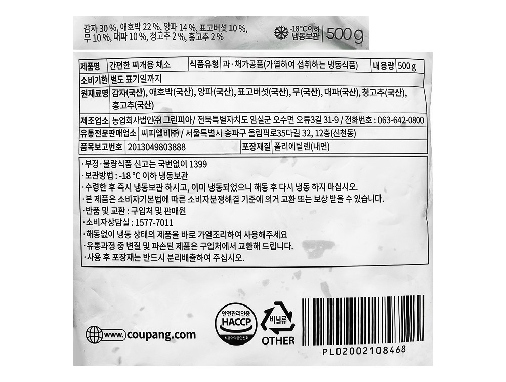 | 포장단위별 내용물의 용량(중량), 수량 | 500g x 3봉,1개 | 원재료명 및 함량 | 컨텐츠 참조 |