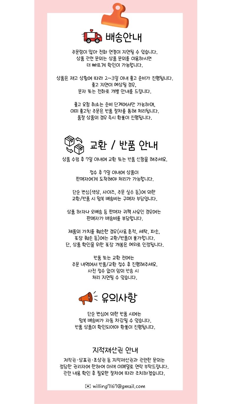 - ㆍ모니터 해상도의 차이로 인해 색상이나 이미지가 실제와 달라, 고객이 단순 변심으로 교환/반품을 무료로 요청하는 경우