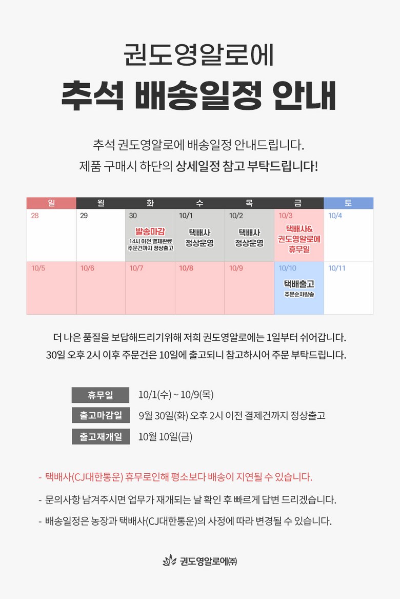 | 제조연월일, 소비기한 또는 품질유지기한 | -제조연월: 연중생산-품질유지기한: 상품 상세페이지 참조 | 세부 품목군별 표시사항 | <농산물>1) 유전자 변형농산물 표시 - 해당사항없음2) 지리적표시 - 울산 울주군 |