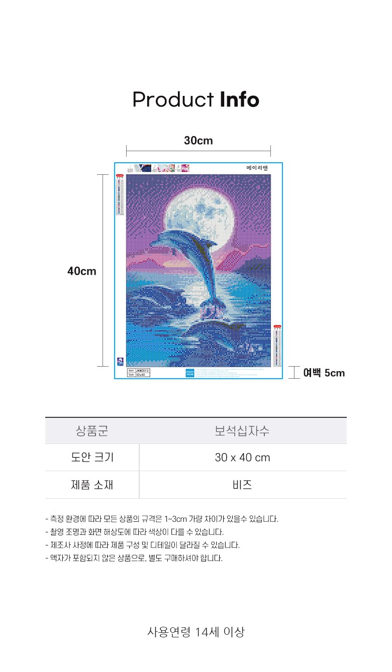 | 품명 및 모델명 | 메이리앤 보석십자수 DIY 비즈공예 키트 30 x 40 cm,0013.돌고래와 달 | 인증/허가 사항 | 해당없음 |