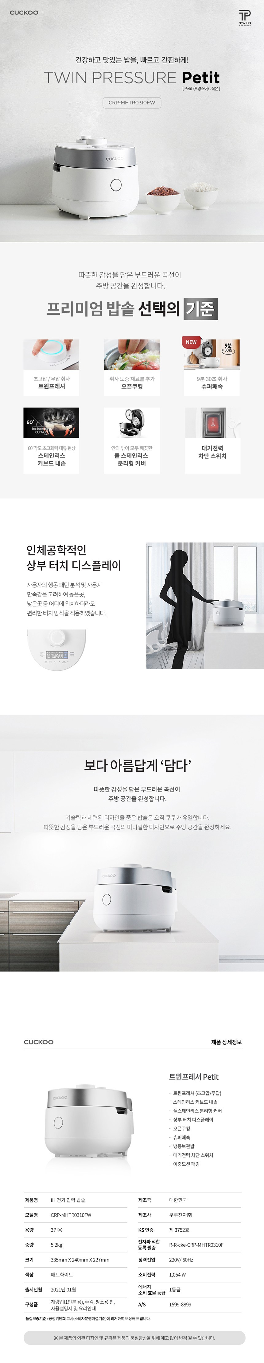 | 품명 및 모델명 | 전기솥 /CRP-MHTR0310FW | KC 인증정보 | KS C 9310 제3752호,R-R-cke-CRP-MHTR0310F |