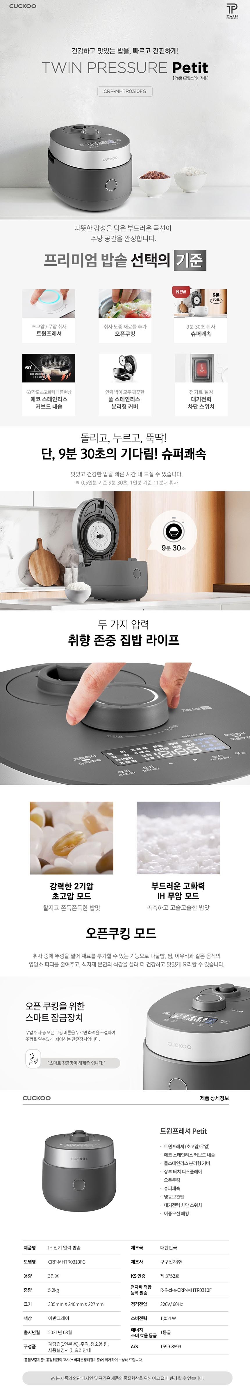 | 품명 및 모델명 | 쿠쿠 트윈프레셔밥솥 3인용 / CRP-MHTR0310FG | KC 인증정보 | KS C 9310 제 3752 호, R-R-cke-CRP-MHTR0310F |