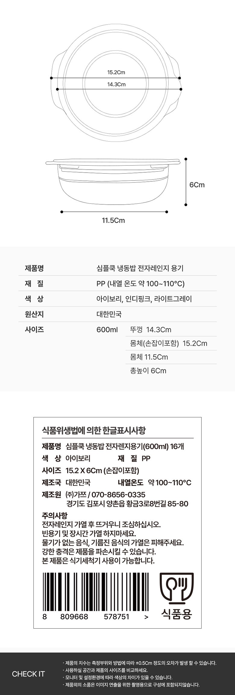 | 품명 및 모델명 | 심플쿡 냉동밥 전자렌지용기 (600ml)16개 아이보리 | 재질 | PP |