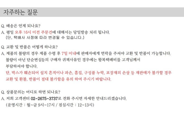 - ㆍ교환/반품에 관한 일반적인 사항은 판매자가 제시사항보다 관계법령이 우선합니다.