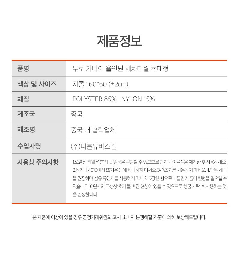 | 품명 및 모델명 | 카바이 초대형 세차타월 | 동일모델 출시년월 | 알수없음 (업체미제공) |