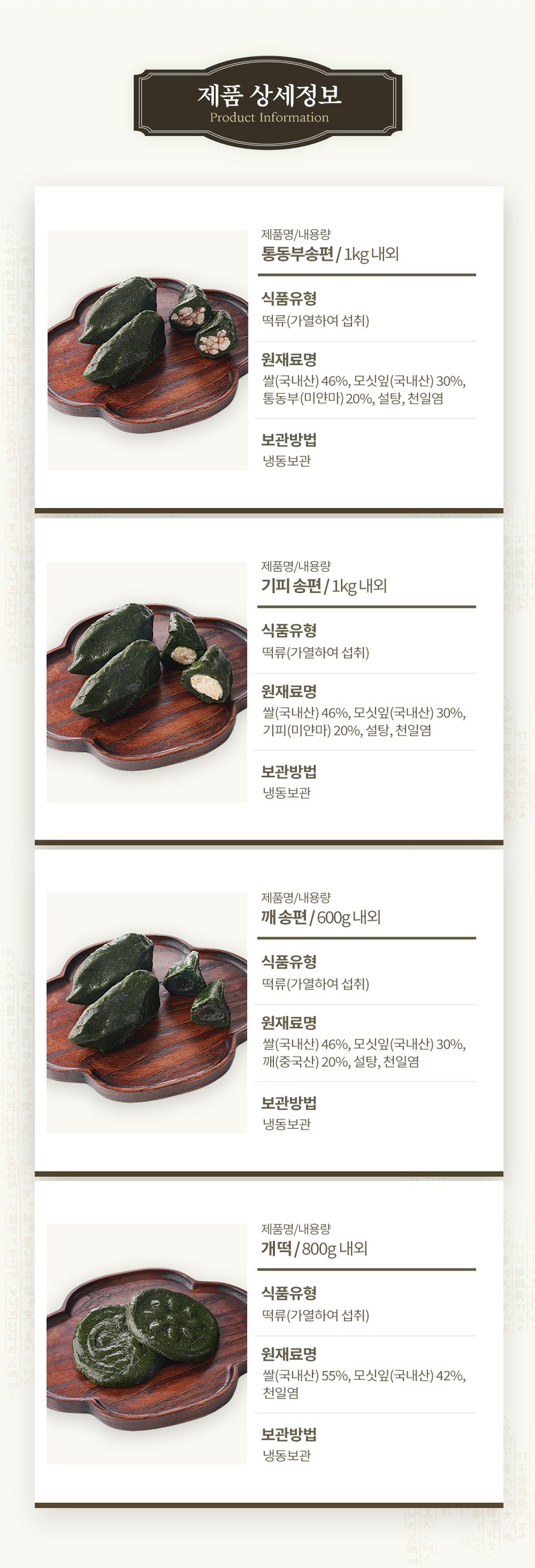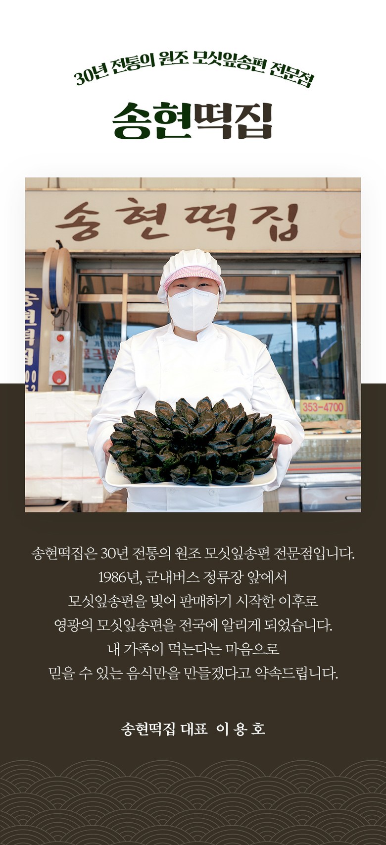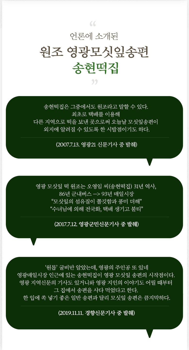 | 생산자 및 소재지 | 송현떡집, 전남 영광군 영광읍 중앙로2길 61-2 | 제조연월일, 소비기한 또는 품질유지기한 | 상시제조, 찐송편) 실온 24시간 이내, 냉동생송편) 6개월이내 |