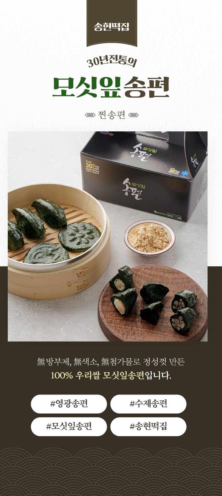 | 제품명 | 송현떡집 영광모시송편 모싯잎송편 (찐송편) 20개 | 식품의 유형 | 떡류 |