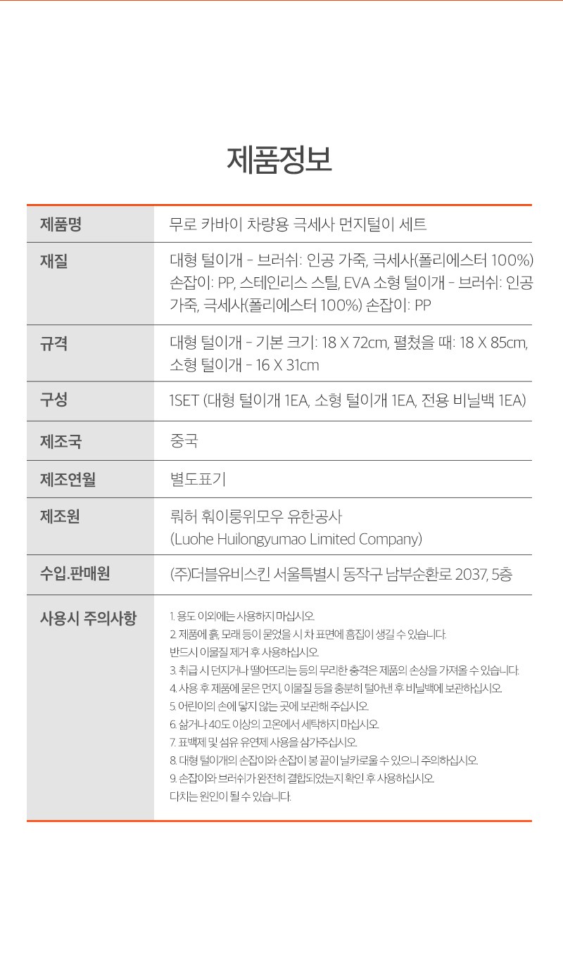 | 품명 및 모델명 | 무로 카바이 차량용 극세사 먼지털이 세트 | 동일모델 출시년월 | 업체미제공 |