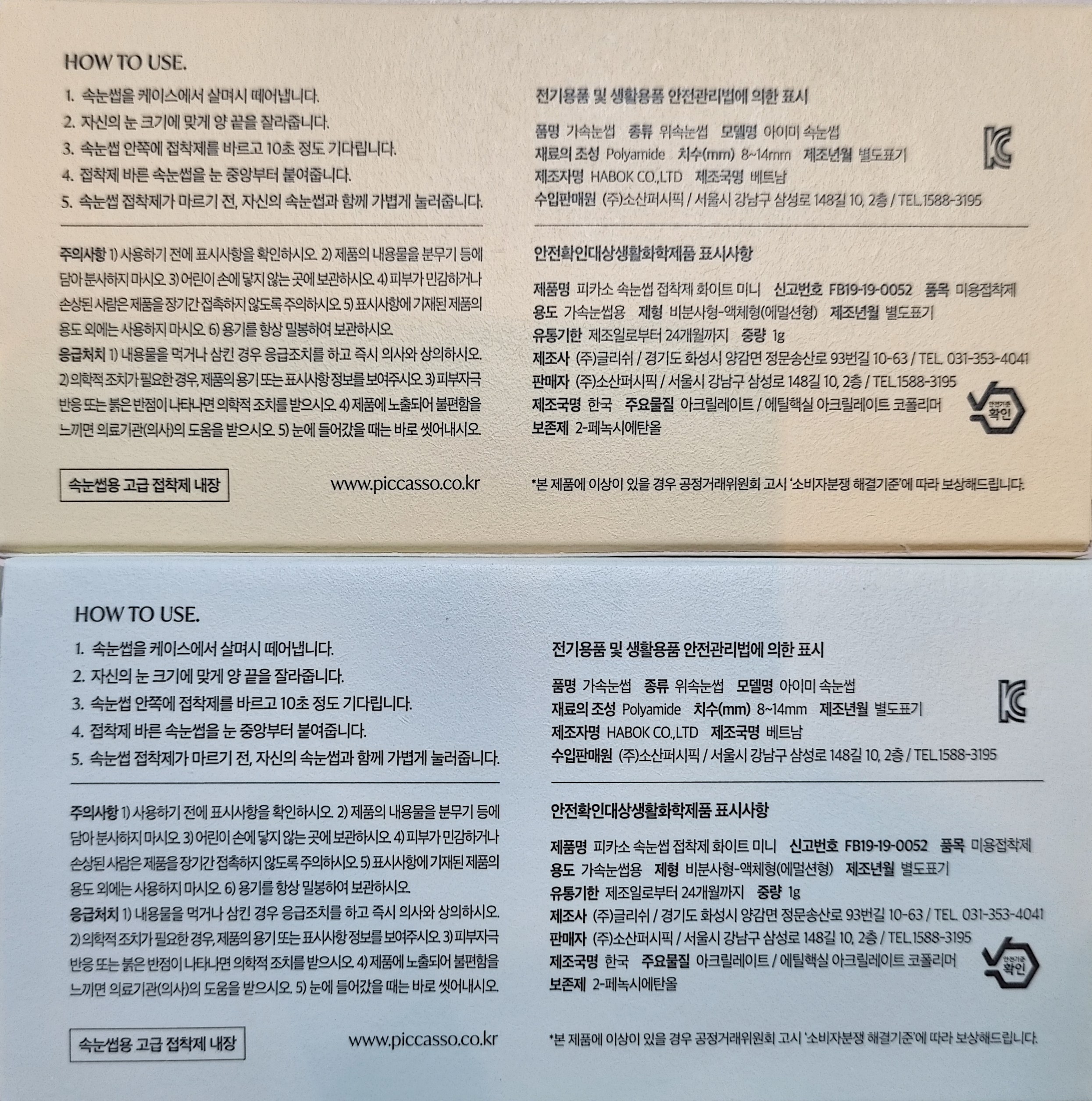 | 제조국(원산지) | 본품: 베트남 / 피카소 속눈썹접착제 화이트 미니: 대한민국 | 제조자(수입자) | 본품: HABOK CO.LTD / ㈜소산퍼시픽, 피카소 속눈썹접착제 화이트 미니: (주)글리쉬 |
