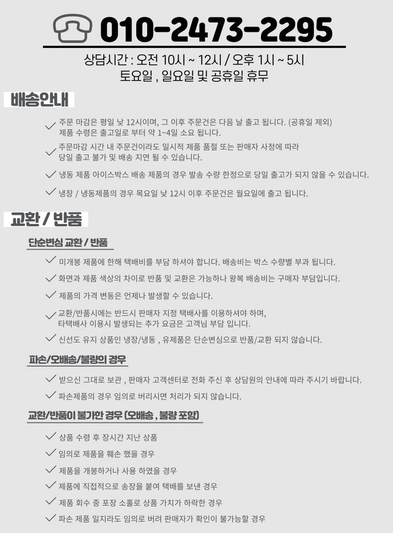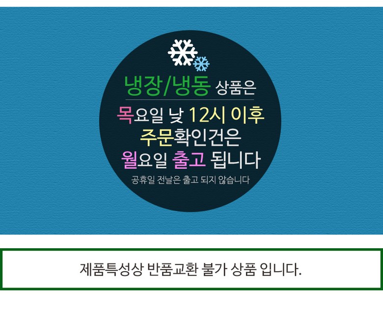 - ㆍ모니터 해상도의 차이로 인해 색상이나 이미지가 실제와 달라, 고객이 단순 변심으로 교환/반품을 무료로 요청하는 경우
